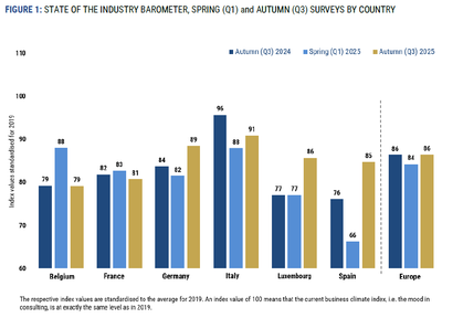 In the Autumn Survey 2025, the European Search and Selection market shows renewed stabilisation after the weakness observed at the beginning of the year. The European overall index rises from 84.3 points in Q1 2025 to 86.5 points in Q3, returning to almost the same level as a year earlier. This development suggests that the downturn in early 2025 was temporary, although the market remains clearly below the peak levels reached in 2021.